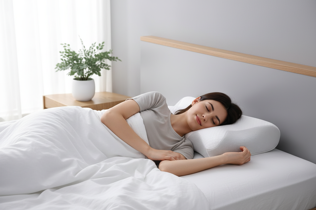 Das ergonomische Nackenstützkissen eignet sich für Rücken- und Seitenschläfer und unterstützt eine natürliche Ausrichtung von Kopf und Nacken während des Schlafs.